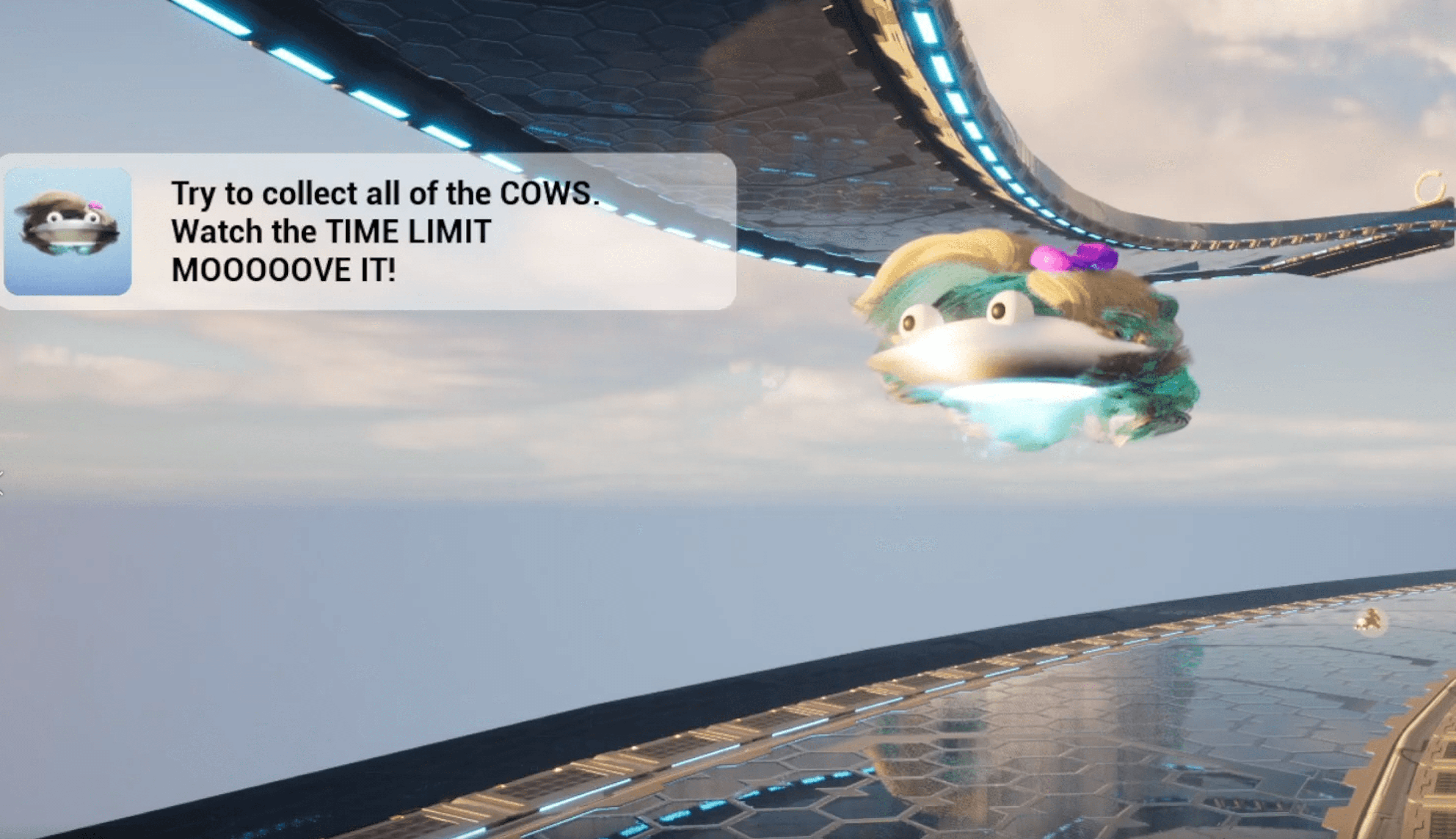 After Rumbleverse's sunset, the Development team worked on a Game Jam. Copy needs were limited but I helped with dialogue and back story for our game, "UFO Stunt Jam." In this image, you'll see some of my work. The "Mother"ship drops you, a tiny UFO with eyes, off to collect lost cows that were abducted. You need to collect all the cows in time so you can make it back to... We didn't get that far. It was a great time writing for something a little different.
