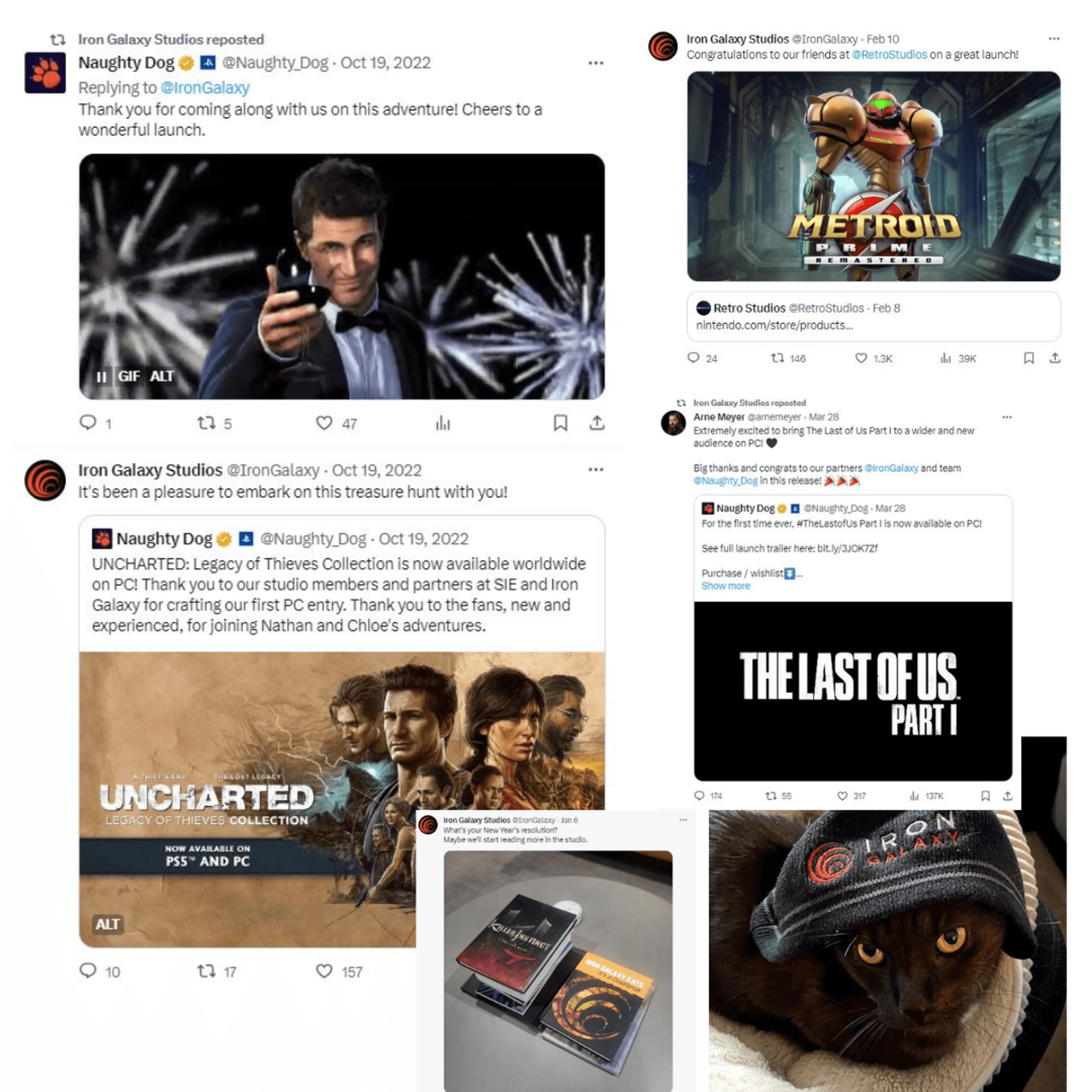 This was a challenge we hadn't fully cracked while I was there. Figuring out how to work with legal at other studios so we could say "Hey we did a thing or two on this too" I'm confident that if I get the opportunity we can crack this. In the meantime, it was a dream to be able to coordinate simple tweets with Nintendo on Metroid Prime Remaster and for Naughty Dog's PC Ports. I can even tell you how the cat in the pic works into damage control on a glitchy launch! Just bring me in for an interview. 😁